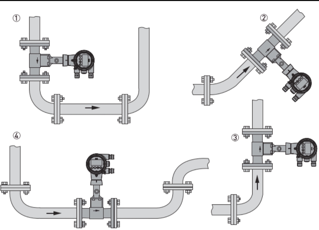 I gcás feidhmeanna gáis/gaile, bíonn an phíblíne lán gáis i gcónaí. Mar sin, is féidir an sreabhadhmhéadar a shuiteáil i sreabhadh ingearach aníos, sreabhadh ingearach anuas, nó treoshuíomh cothrománach. Mar sin féin, ní mór é a shuiteáil ag pointí ísle. Is iad na suíomhanna suiteála molta: