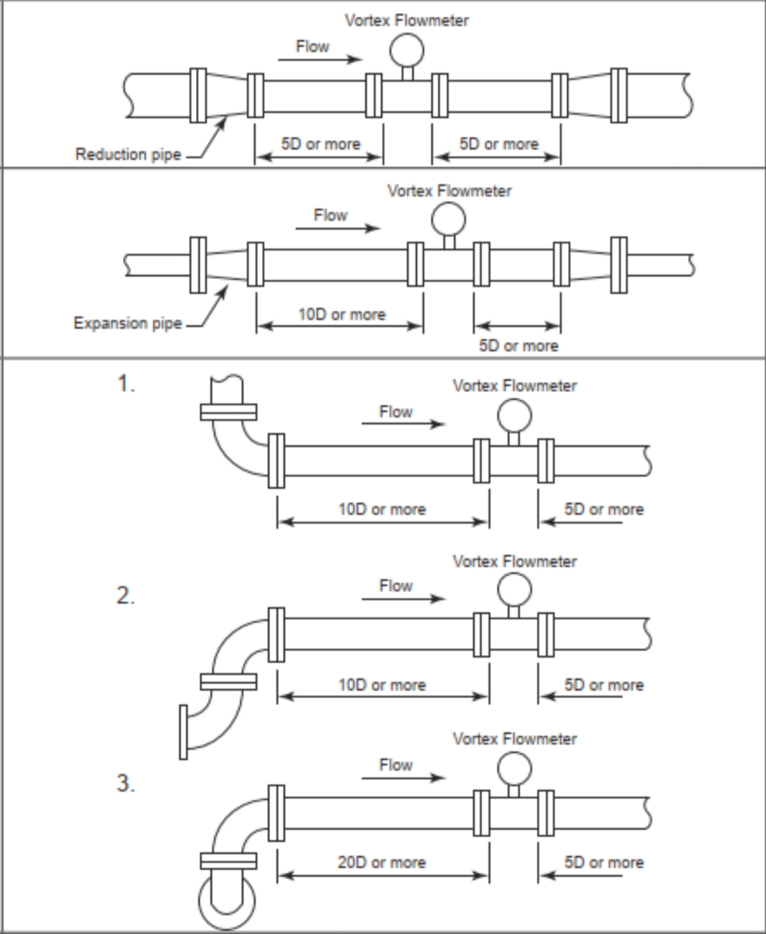 3. Rannóga píopa díreach in aghaidh an tsrutha agus le sruth (má tá gá le hionstraimí teochta agus brú, ba chóir iad a shuiteáil le sruth den sreabhmhéadar. Ba cheart na hionstraimí anuas a bheith suite lasmuigh den chuid píopa díreach freisin. Is é an t-ordú socraithe molta d'ionstraimí iolracha ná: sreabhmhéadar, tarchuradóir brú, tarchuradóir teochta). Go ginearálta, déan tagairt do na ceanglais maidir le fad píopa díreach a shonraítear i sampla táirge an mhonaróra (nó an treoirlíne coiteann 15D in aghaidh an tsrutha agus 5D le sruth de réir na lámhleabhair ionstraimí). Cuir an fhoireann innealtóireachta píopaí ar an eolas roimh ré faoi na ceanglais maidir le píopa díreach in aghaidh an tsrutha agus anuas don sreabhmhéadar vortex. Nuair a roghnaítear monaróir na hionstraime, ní mór na ceanglais suiteála a athdhearbhú de réir shonraíochtaí an mhonaróra.